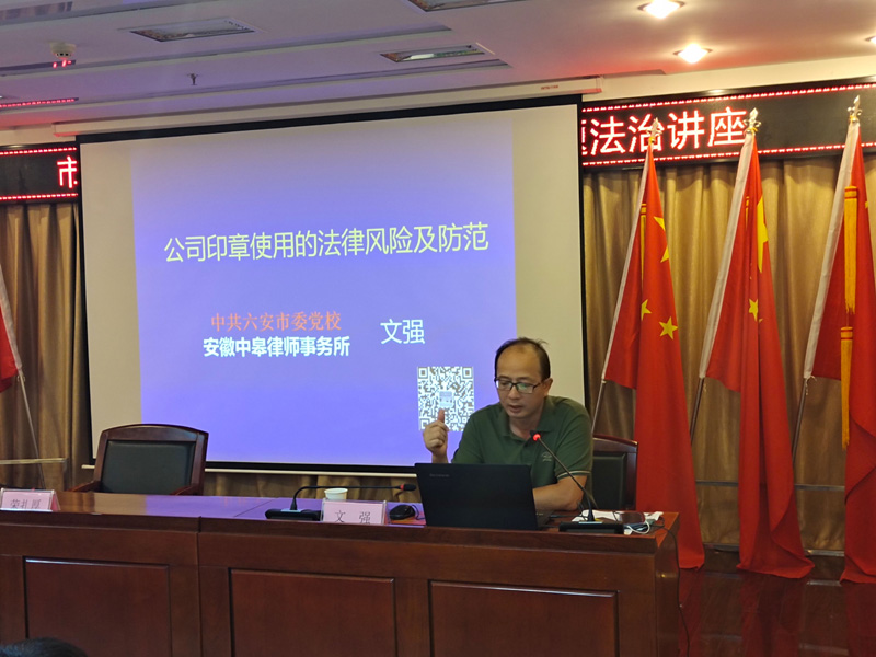 讲座上,市“八五”普法讲师团成员、市委党校法宣办主任文强以“企业印章使用的法律风险及防范”为主题,围绕企业印章的种类、用途及功能,印章使用中的常见风险点以及如何规避印章使用的法律风险等内容进行细致讲解,讲座内容具有指导性和针对性,贴近工作实际。
